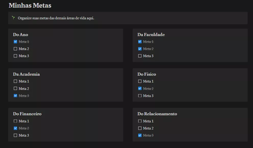 Desenvolvido para ser intuitivo, o Natty Mind oferece seções específicas que ajudam você a ter clareza e controle sobre suas atividades, garantindo que nada fique para trás. Com ele, você pode visualizar seu progresso, planejar seus objetivos e se manter motivado ao longo do tempo.